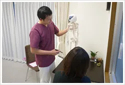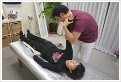 まず、立った状態でお身体の状態を確認させていただき、そのまま、上半身を中心に調整を行います。